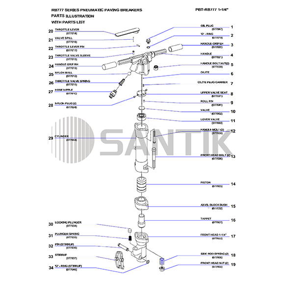 The RB777 pneumatic rock drill is a classic handheld air-powered tool primarily used for breaking concrete, rock, asphalt, and other hard materials. It is widely applied in mining, road construction, demolition projects, and other fields. As a cost-effective and reliable pneumatic tool, it has gained extensive use in mining and construction demolition.
