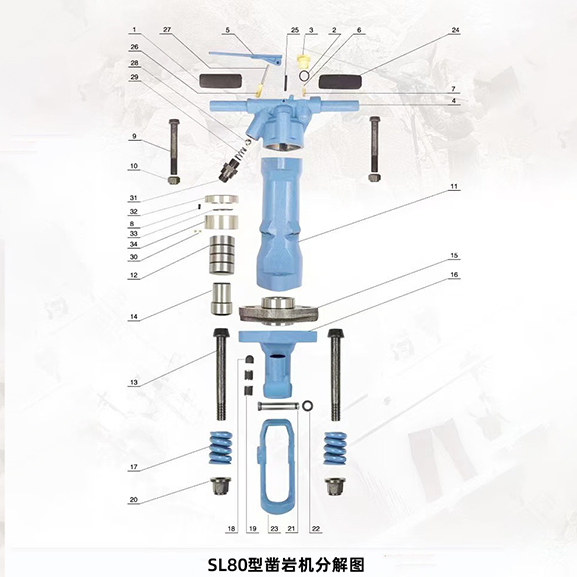 The SL80 air hammer operates using compressed air as its power source. The compressed air flows through the air hose into the valve system at the back of the hammer. The valve then distributes air to the upper and lower chambers of the cylinder, driving the hammer piston in a high-speed reciprocating motion. This motion continuously delivers powerful impact energy to the chisel, efficiently breaking concrete into pieces.